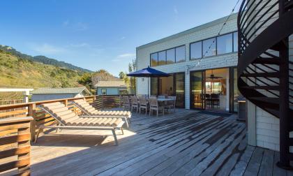 Sleek, modern lines with a coastal comfort vibe inside, this Stinson Beach house has it all. Inspired living and everything you want in a second home retreat. This is one of only 7 homes in this beach town cul-de-sac and you are #1. You are just steps away from the slice of heaven called Stinson Beach and access to the calm waves of the Pacific Ocean. The home takes advantage of incredible mountain vistas as well as fulfilling that beach front dream. Perfection in a beach house is creating the perfect amount of indoor/ outdoor space and living. What makes Water’s Edge so unique is also the compound feel when you are on this property. It’s large decks and manicured grounds compliment this home to make it feel like the world’s best resort that is actually your house! It has a separated guest suite as well. You are able to walk or bike to town and easy you have easy access to all the hiking trails that makes Stinson one-of-a-kind home away from home.